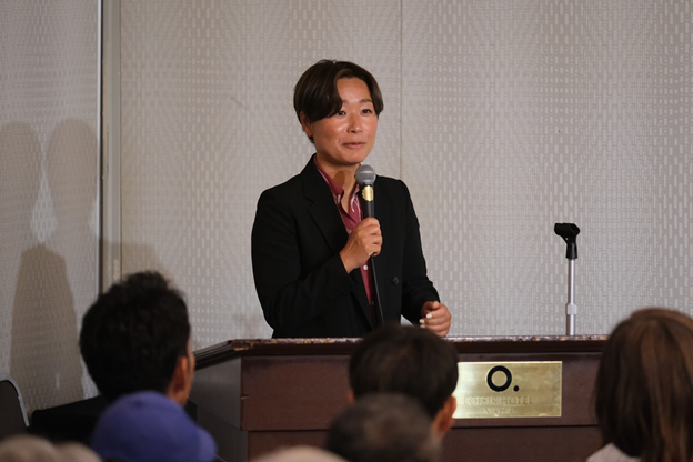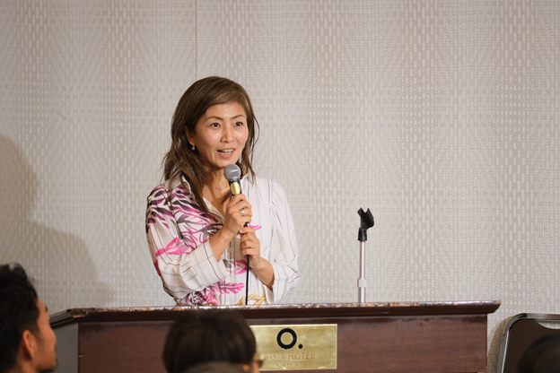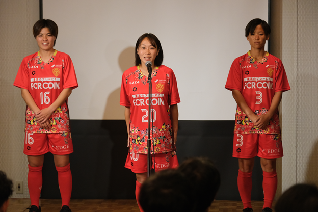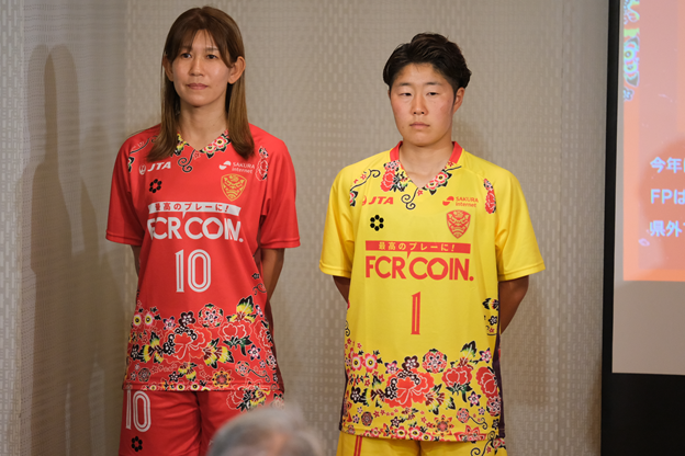 「私からはチームの方針をや女子サッカーの可能性についてお伝えします。FC琉球さくらは、『カチャーシーフットボール』というテーマを掲げ、沖縄の伝統文化であるカチャーシーを、サッカーで表現できるように3つの点を大切に考えています。①ゆいまーる(仲間を思いやり支えあう精神)②闘うむさん(苦境すらも楽しみに変えて挑戦する積極性)③This is me(女性が自己表現し、胸を張る姿)この3つの事柄をもって、攻撃で主導権を握るサッカーを目指し、毎試合3ゴール生まれるゲーム運びを志向しています。また、選手は仕事をしながら、サッカー選手であり続けることで、サッカー以外の魅力を持ち、多くのことを学ばせてもらっており、このような姿がThis is meであり、日本の美学であるひたむきさや謙虚さが加わると、最強になると思っております。なでしこリーグに昇格し、たくさんの方々とともに喜び、沖縄に明るいニュースを届け、今シーズン最後に最高の笑顔で迎えられるよう、皆さまお力添えをよろしくお願いいたします。」