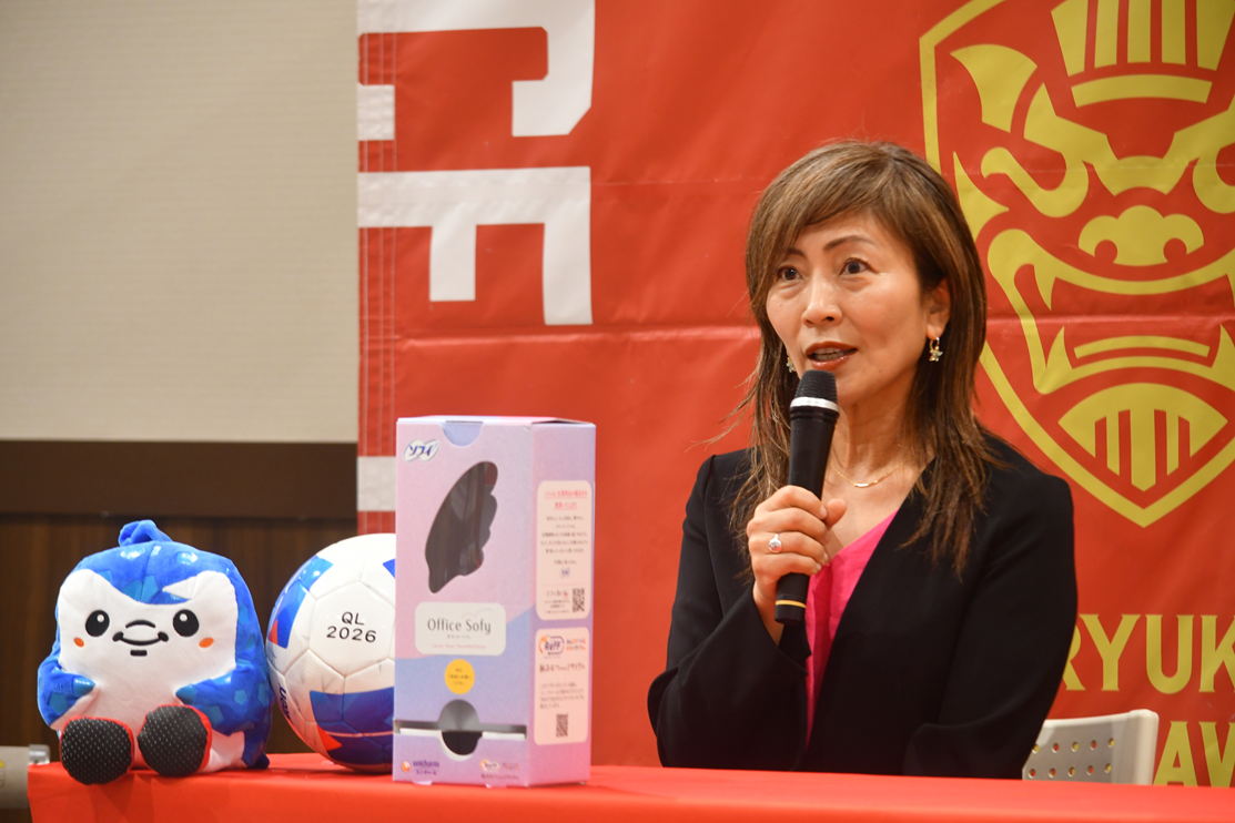 「今回、生理用品を沖縄県内の小・中・高校495校に届けるという活動を、レッドボックスジャパン様と一緒に実施できることを光栄に思います。FC琉球さくらとFC琉球さくらaleは、女子のサッカーチームですので、生理については当事者であり、生理が原因で、学校に行けない場面やスポーツ競技に集中できない経験もあります。WEリーグやJリーグでも、生理に関する活動を実施していますが、生理で苦しいときに、身近に生理用品があることがごく当たり前の社会になっていく社会になるように、沖縄からこの活動を発信していきたいと思っております。」