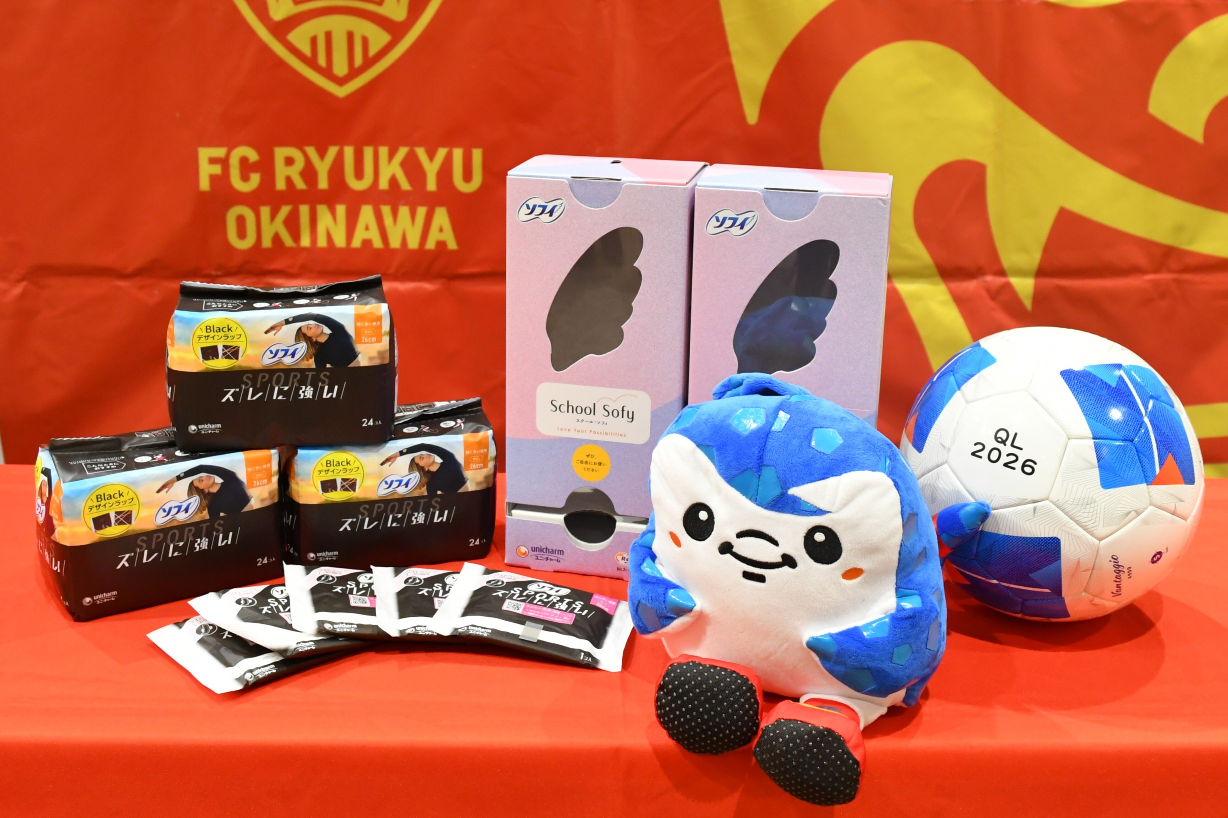 このプロジェクトは、生理を理由に学習機会やスポーツを楽しむ機会が制限されることのない環境整備を目的としており、今回は、沖縄県内495校へ生理用品を送り届けるために、3/28(土)にイオンモール沖縄ライカムにて、FC琉球さくらの橋本祥子選手、小池雪月選手、高橋杏奈選手と、FC琉球さくらaleの選手たちが、ユニ・チャーム株式会社様の「どこでもソフィ」を梱包し、発送する取り組みを実施いたしました。