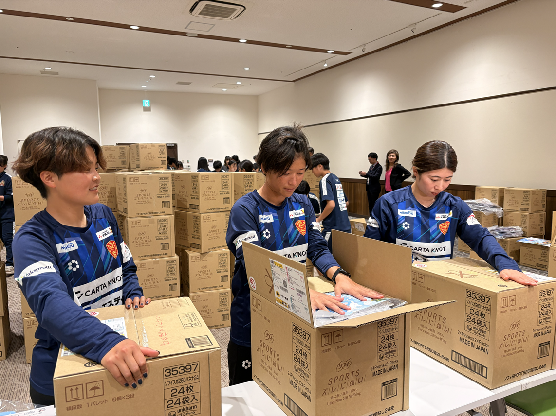 FC琉球さくらaleの選手たちは、中高生年代であり、成長期の不安定な生理は、学校生活やスポーツをするにあたって、大きく関わってきています。生理のときでも快適に過ごせるよう、このような機会に生理について考え、学ぶことで、改めて自身の体について見つめなおす機会となりました。生理用品を梱包したダンボールに、メッセージを添えて発送作業にあたっていたことが印象的でした。