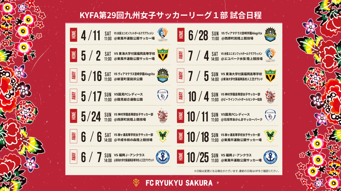 このたび、FC琉球さくらが2026シーズン所属するKYFA第29回九州女子サッカーリーグ1部の試合日程が決定いたしましたので、お知らせいたします。