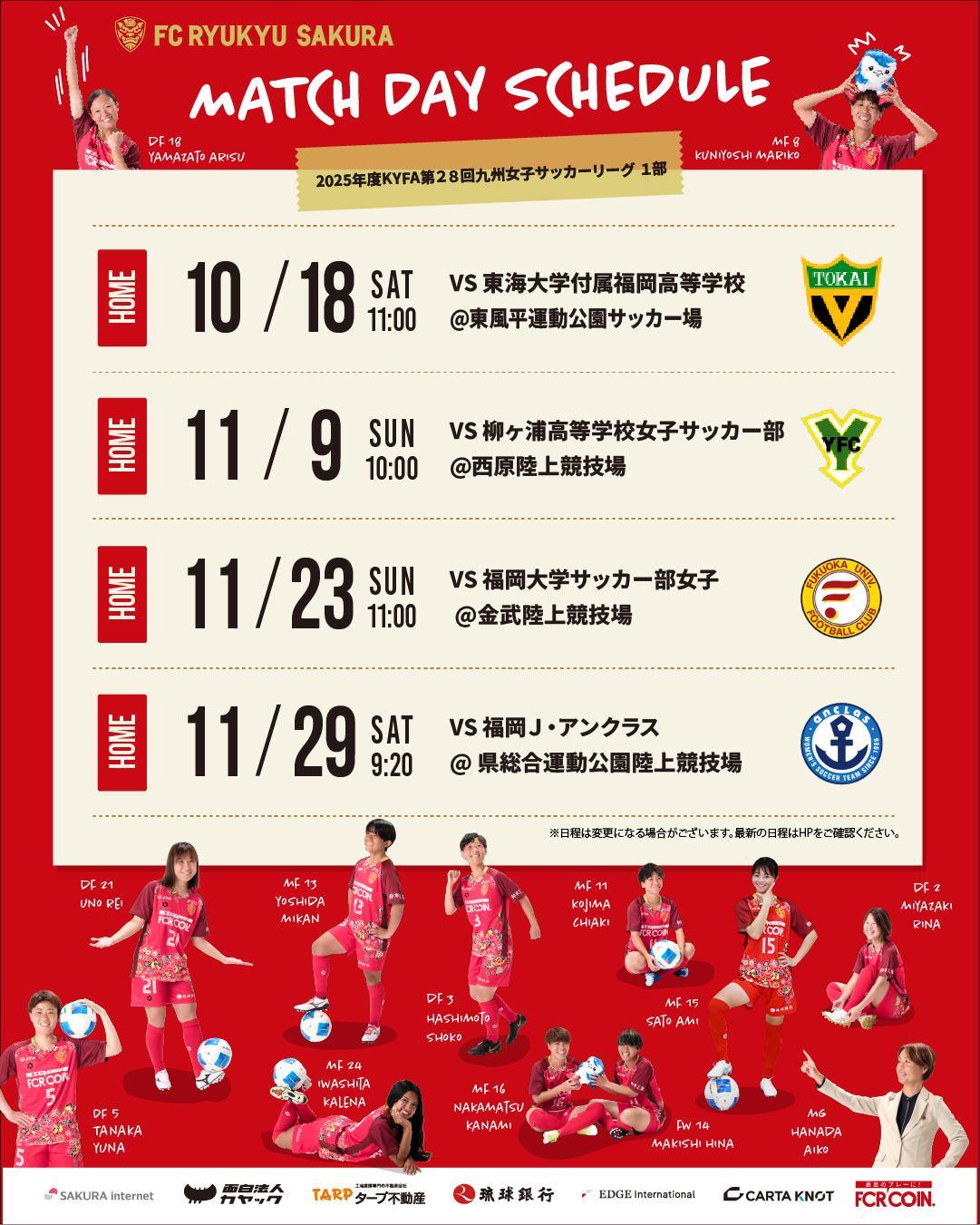 FC琉球さくら 11/29(土)福岡J・アンクラス戦 キックオフ時間/会場決定のお知らせ