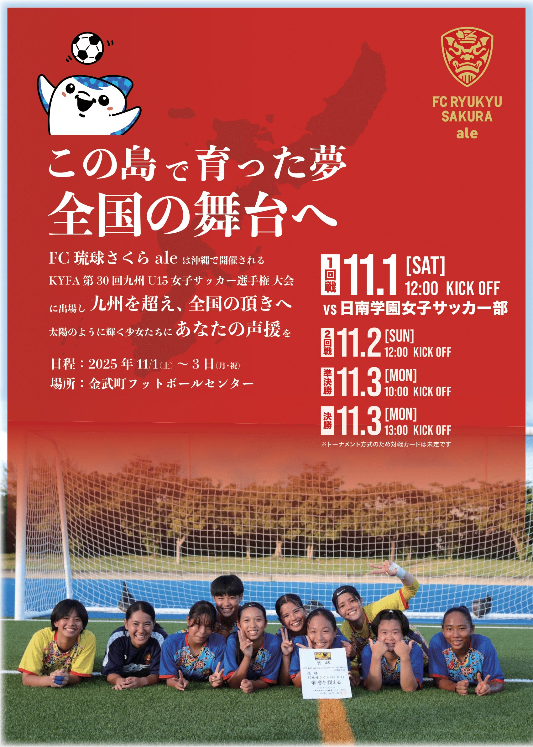 8年ぶりに沖縄で開催される「KYFA第30回九州U-15女子サッカー選手権大会」に、FC琉球さくらale U-15が出場いたしますのでお知らせいたします。トップチーム同様、皆さまの温かい応援をよろしくお願いいたします!