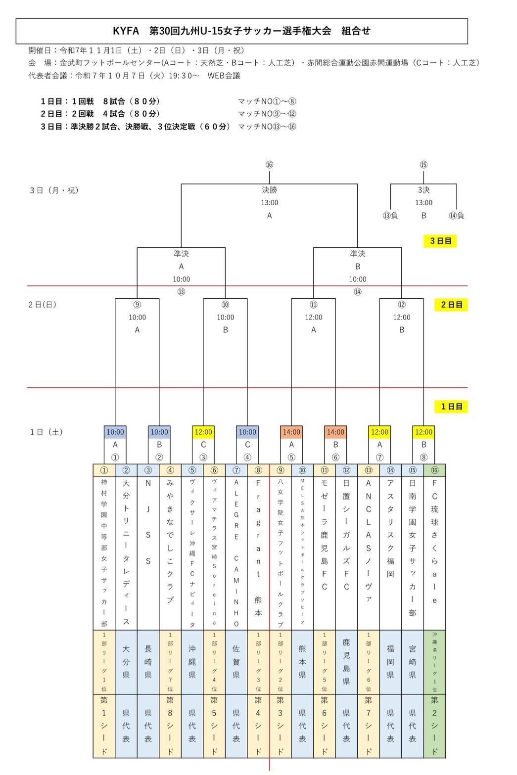 九州各県より選出された8チームと、JFA U-15女子サッカーリーグ2025 九州1部リーグの前期終了時点(シード順位)での7チーム、沖縄リーグの上位1チームの計16チームが出場。優勝以下第4位までが、高円宮妃杯JFA第30回全日本U-15女子サッカー選手権大会(2025年12月6日~26日@味の素フィールド西が丘ほか)への出場資格を獲得します。