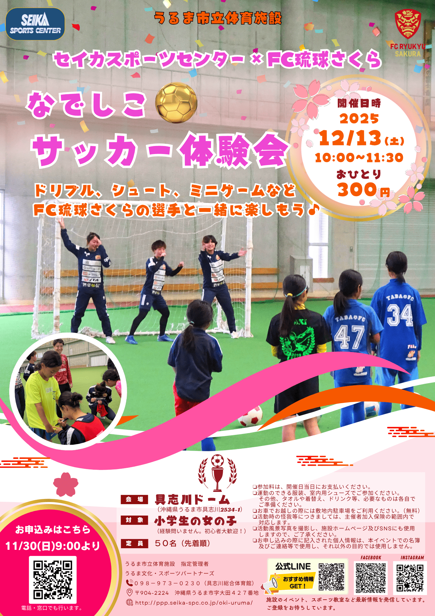 FC琉球さくらは12月13日(土)、うるま市の具志川ドームにて、小学生の女子を対象としたサッカー体験会を実施いたします。現在参加者を募集しております。QRコードもしくはお電話にて、ぜひ皆さまお誘いあわせの上、ご参加ください!
