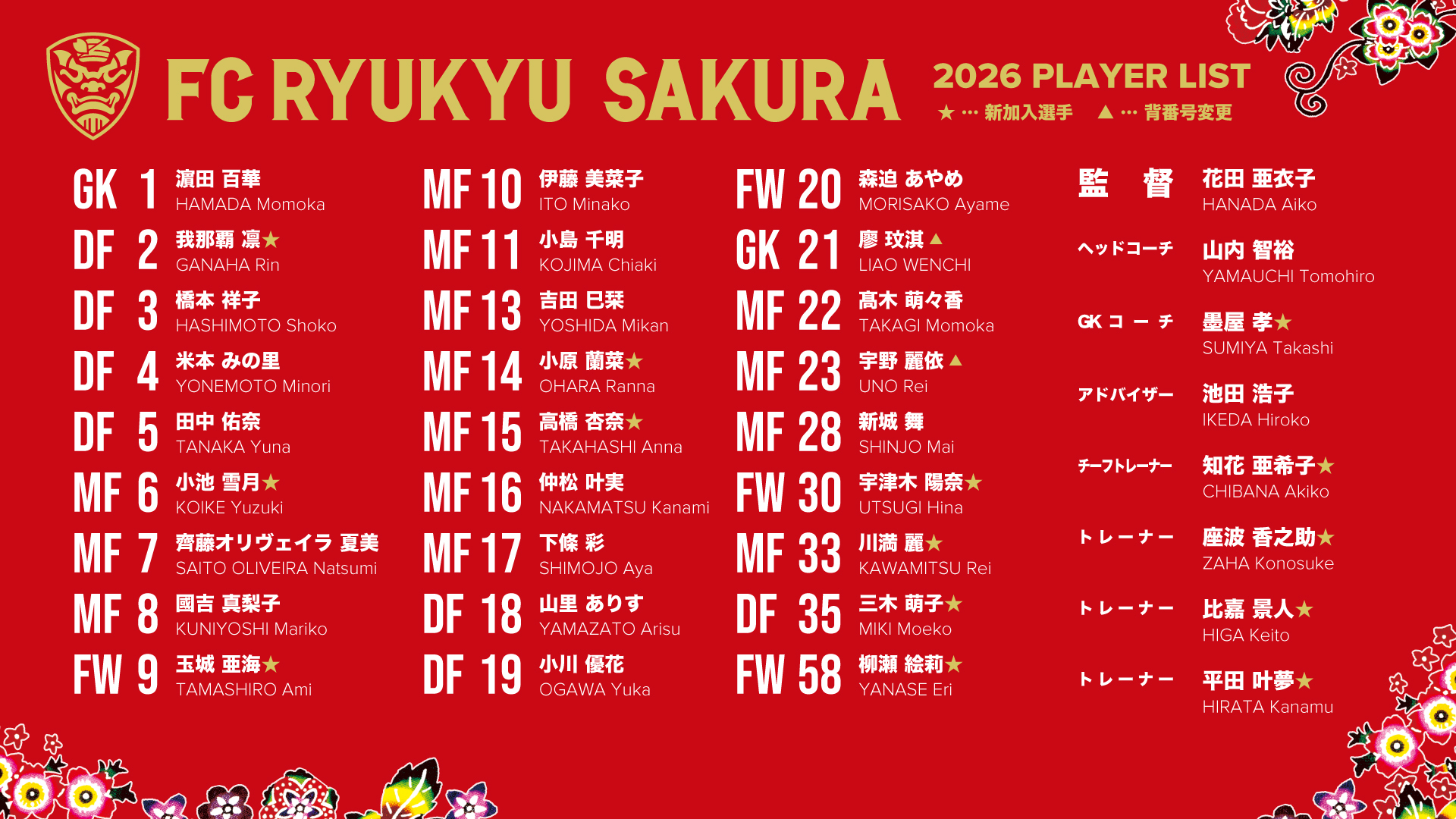 このたび、2026シーズンにおけるFC琉球さくらの選手・スタッフ体制、選手の背番号が決まりましたので、お知らせいたします。